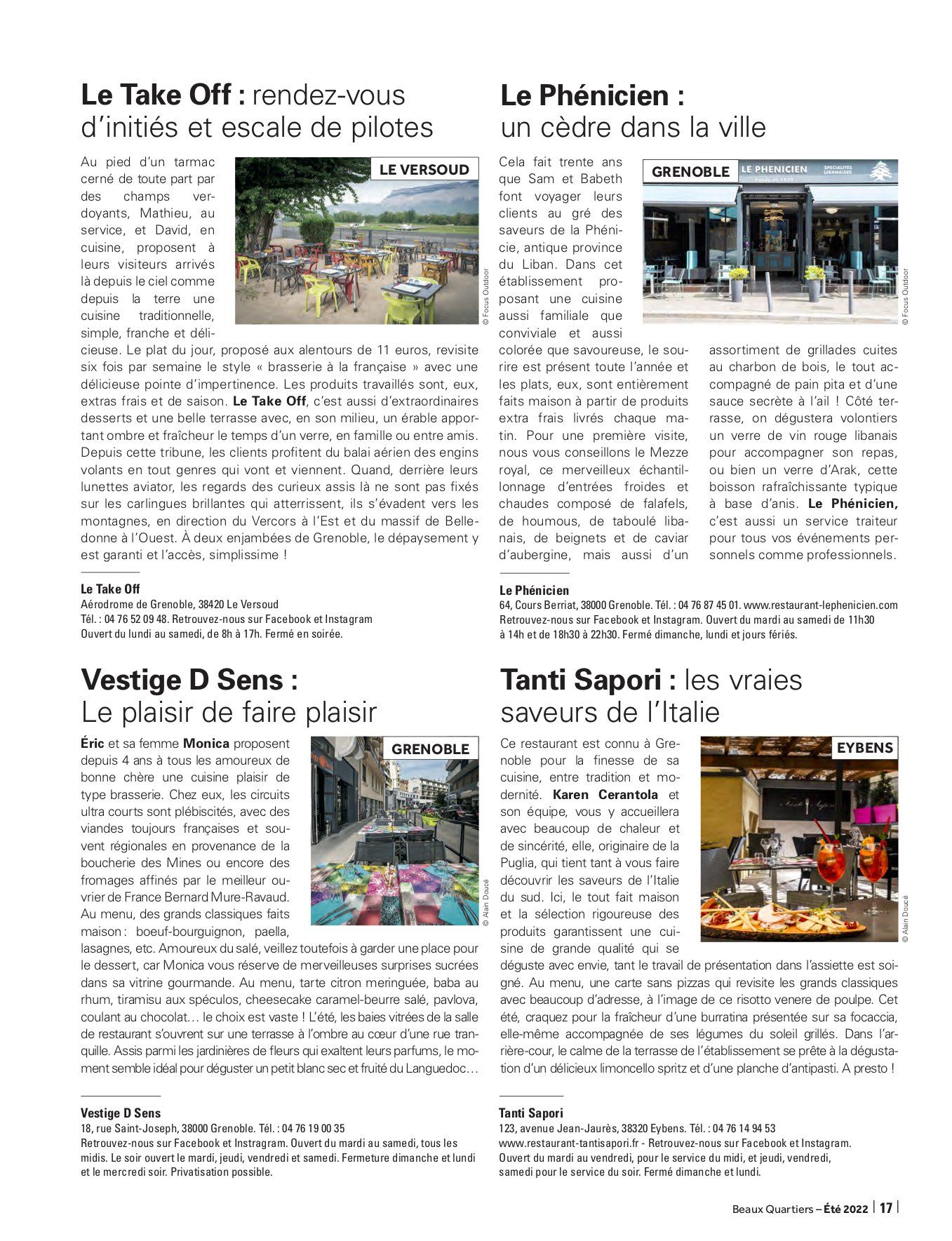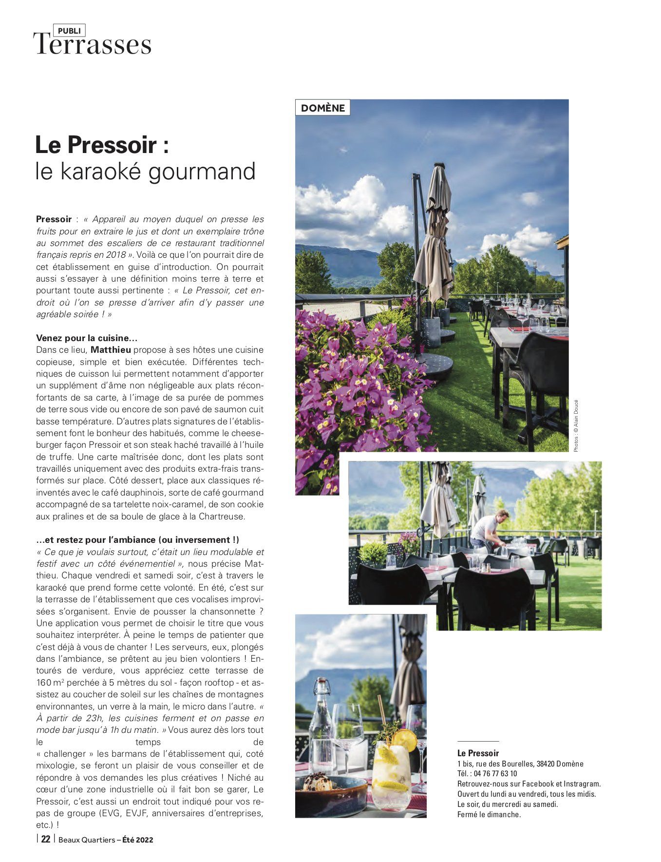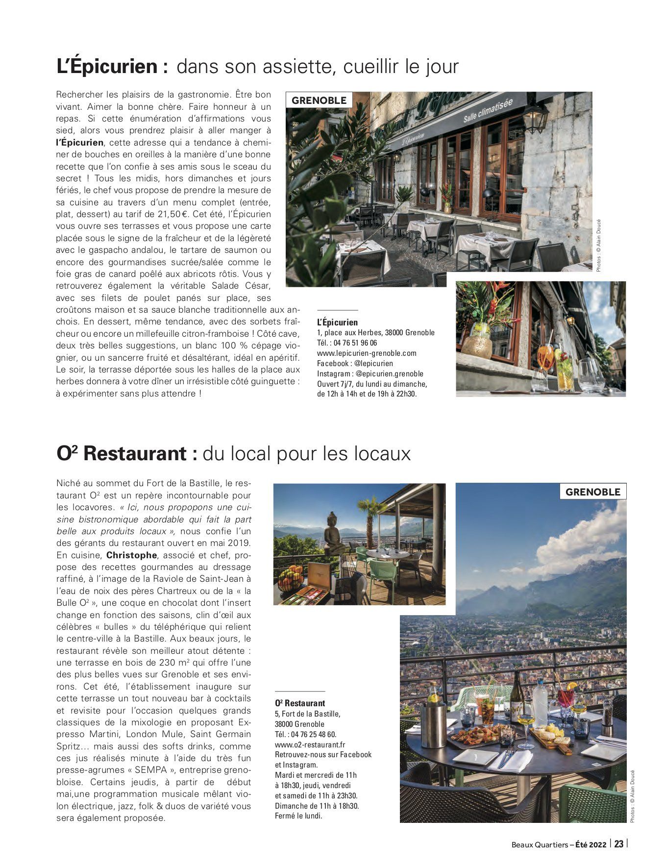 Spécialiste de la communication rédactionnelle et rédacteur indépendant, Valentin JACQUELIN collabore chaque trimestre avec le magazine haut de gamme grenoblois Beaux Quartiers dans le cadre de la rédaction d'un dossier thématique. Ce trimestre, il a déniché pour vous de bien belles adresses, histoire que vous passiez l'été aux terrasses d'établissements qui valent réellement le détour, que se soit pour leurs vins, leurs cocktails, leur cuisine, leur cadre ou encore leurs concepts. Bonne lecture ... et surtout, belle dégustation !