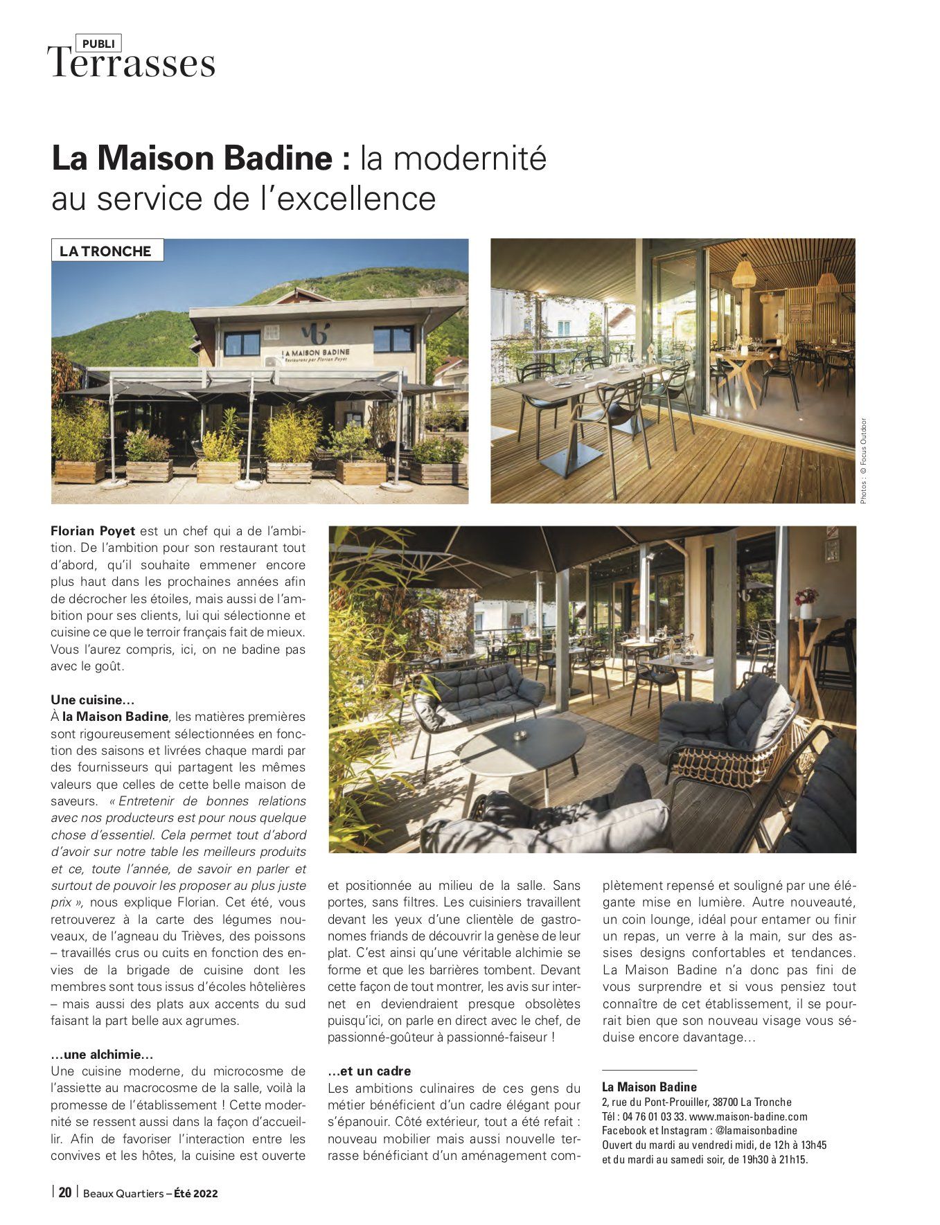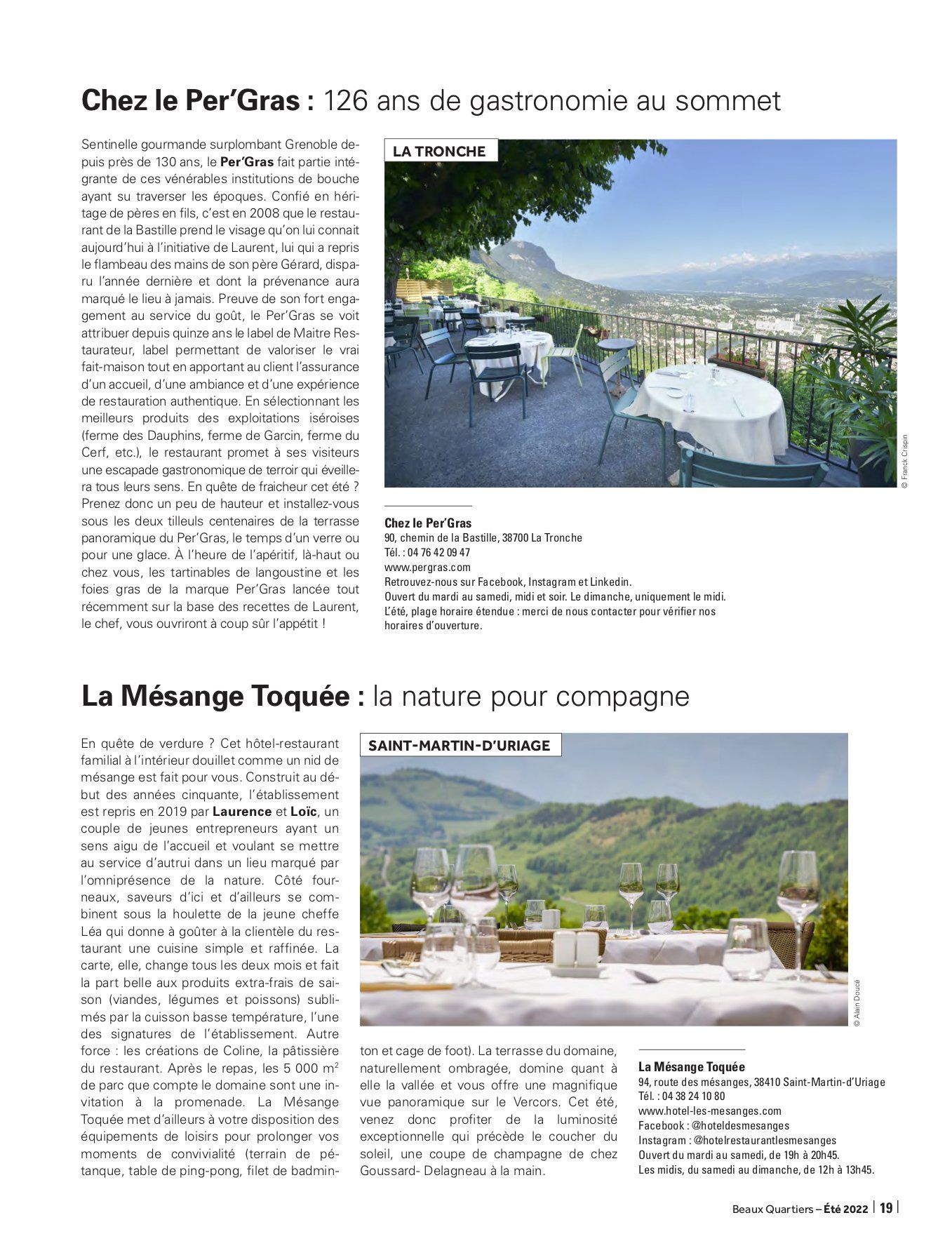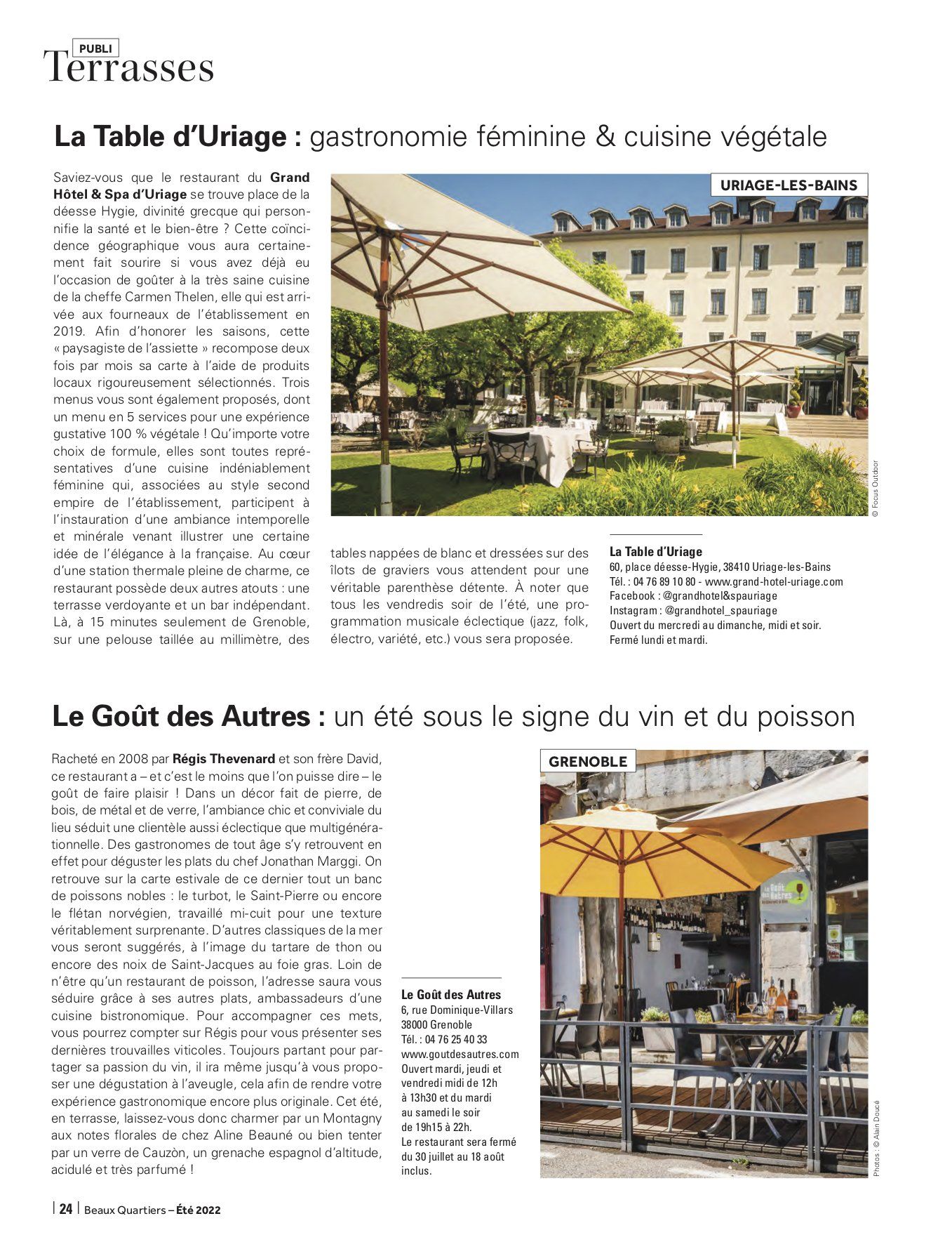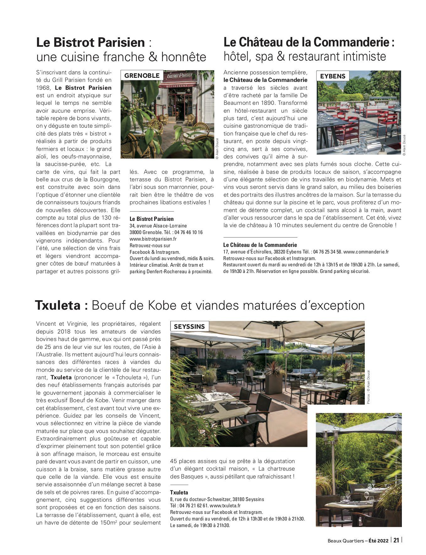 Spécialiste de la communication rédactionnelle et rédacteur indépendant, Valentin JACQUELIN collabore chaque trimestre avec le magazine haut de gamme grenoblois Beaux Quartiers dans le cadre de la rédaction d'un dossier thématique. Ce trimestre, il a déniché pour vous de bien belles adresses, histoire que vous passiez l'été aux terrasses d'établissements qui valent réellement le détour, que se soit pour leurs vins, leurs cocktails, leur cuisine, leur cadre ou encore leurs concepts. Bonne lecture ... et surtout, belle dégustation !