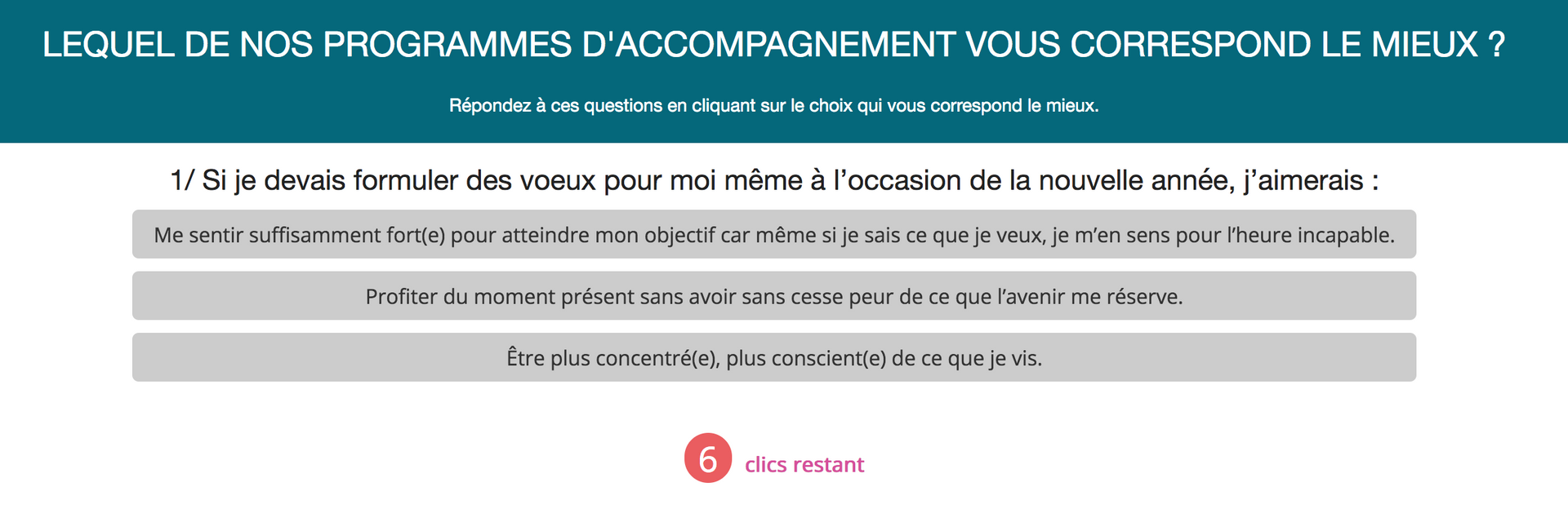Toujours dans cette optique de rendre le site interactif, nous avons mené un travail de gamification en proposant un test en ligne afin d'orienter le visiteur vers le programme d'accompagnement le plus en lien avec ses besoins et attentes du moment.